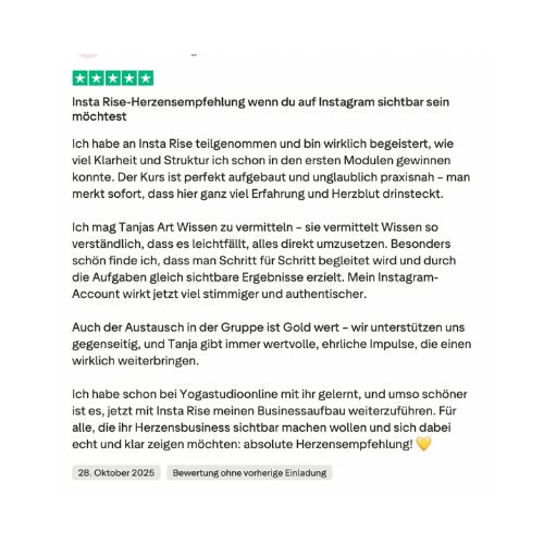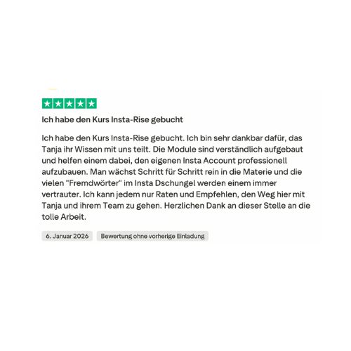 Mit der richtigen Strategie kann dein Instagram-Kanal in 1 Stunde pro Woche 80 % deiner Neukunden bringen. Ich weiß, weil ich es selbst so aufgebaut habe – und weil meine Teilnehmerinnen genau das umsetzen.